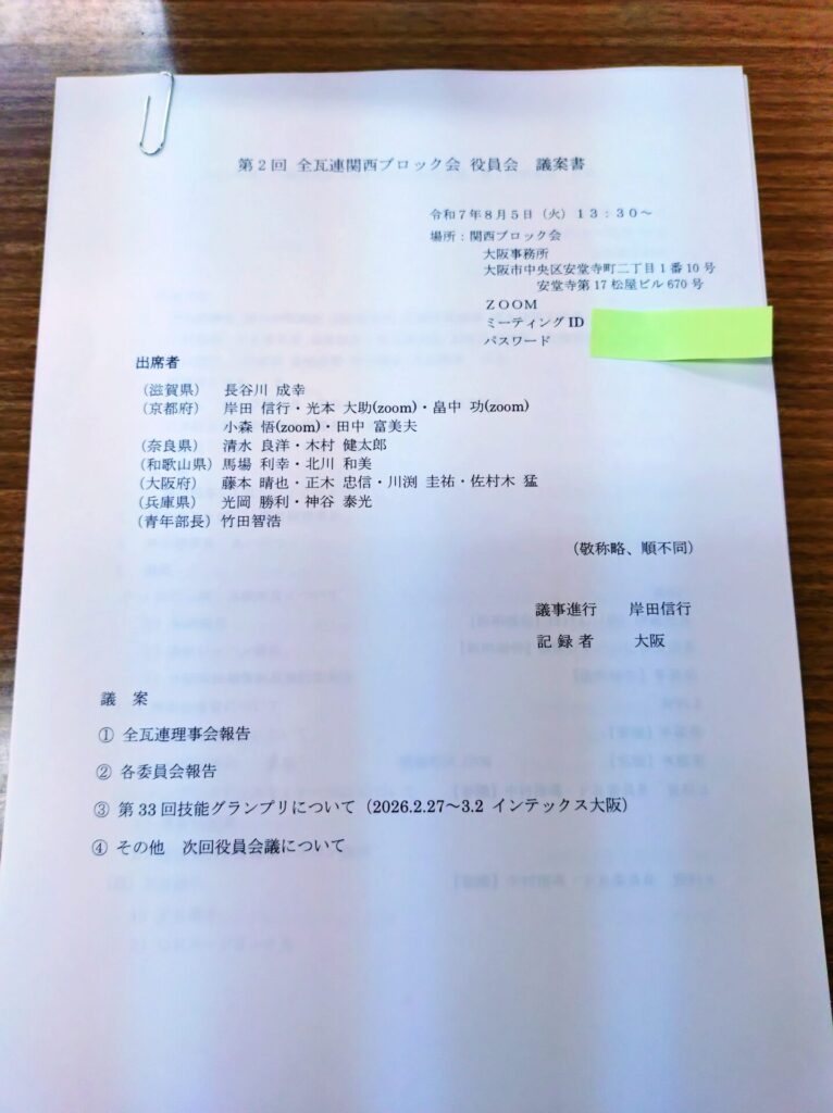 今回は全瓦連理事会報告や各委員会報告、来年に開催される第33回技能グランプリin大阪(2026.2.27~3.2inインテックス大阪)が主な内容でした。