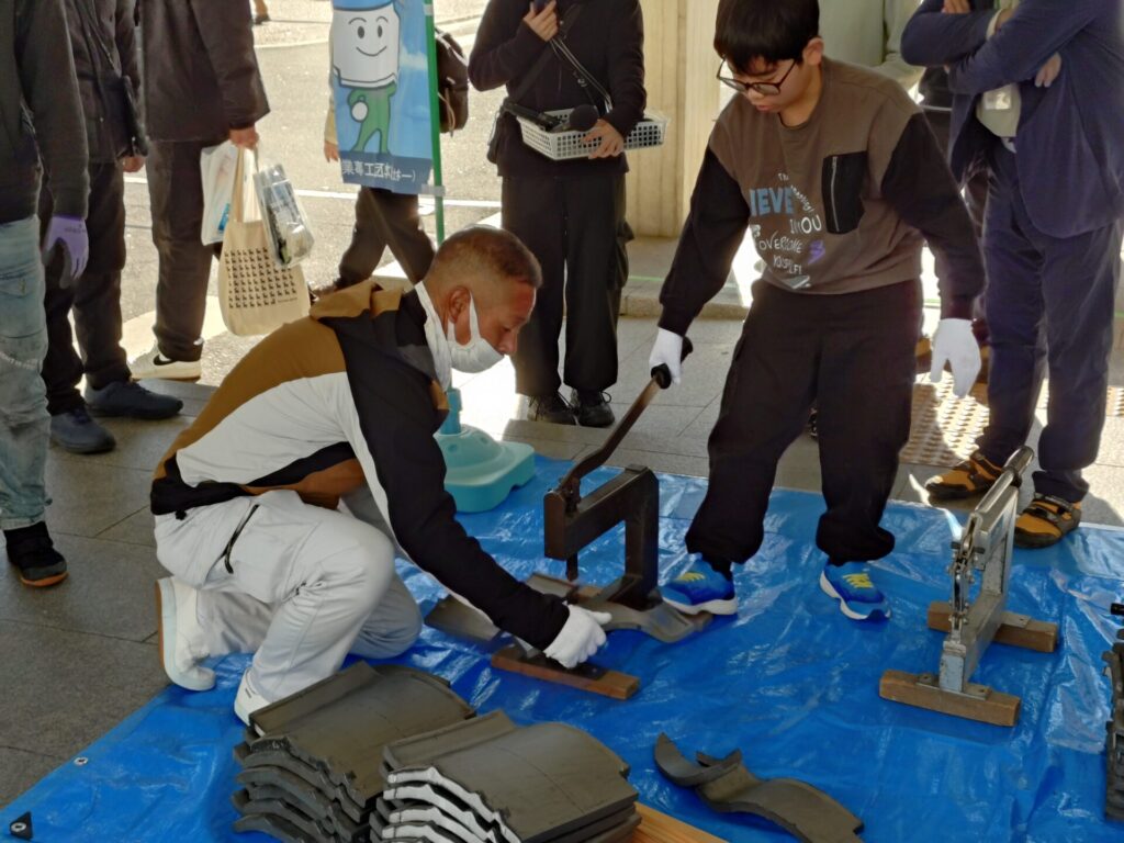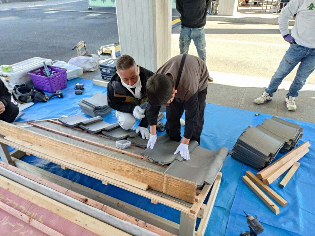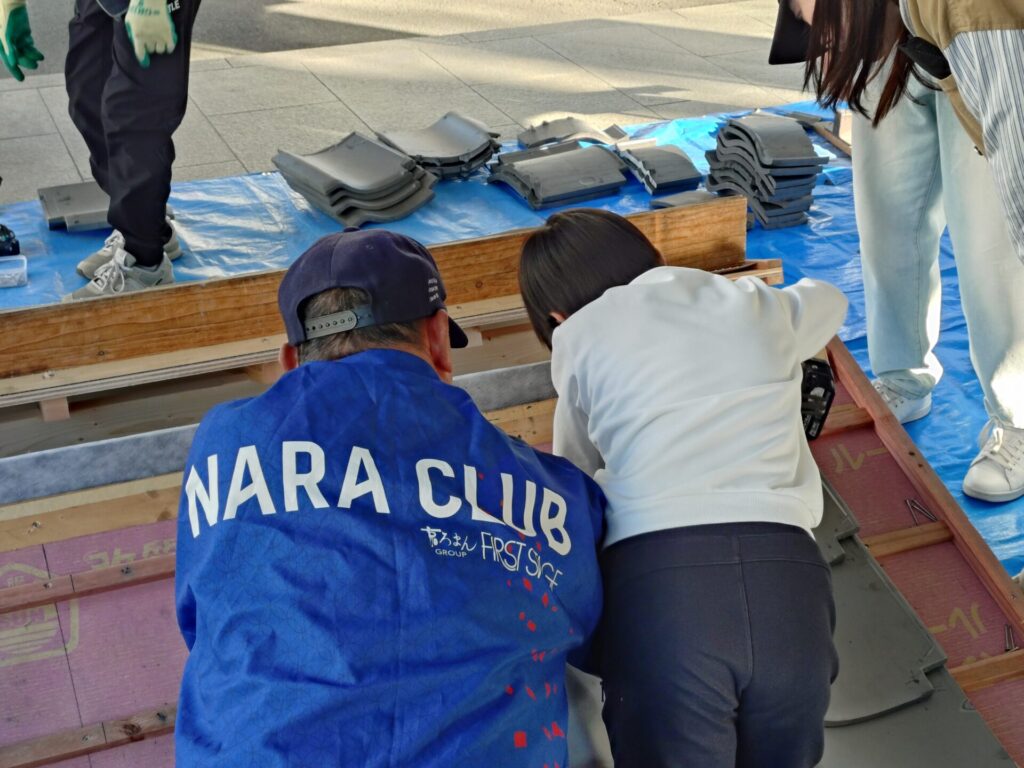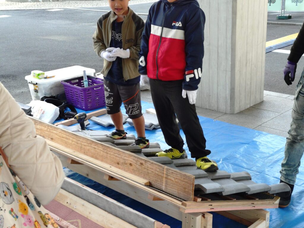奈良県瓦工事業協同組合としては、架台を使った「かわらぶき体験」を実施しました。日本瓦を小学生・中学生に葺いてもらい(並べてもらい)、ビス留めをし、瓦カッター(押し切り)を使った瓦加工もしてもらいました。その後、実際に瓦を葺いた屋根(架台)に乗ってもらいました。これは若年技能者人材育成支援等事業として「ものづくりマイスター(熟練技能者)」による指導の下、行いました。