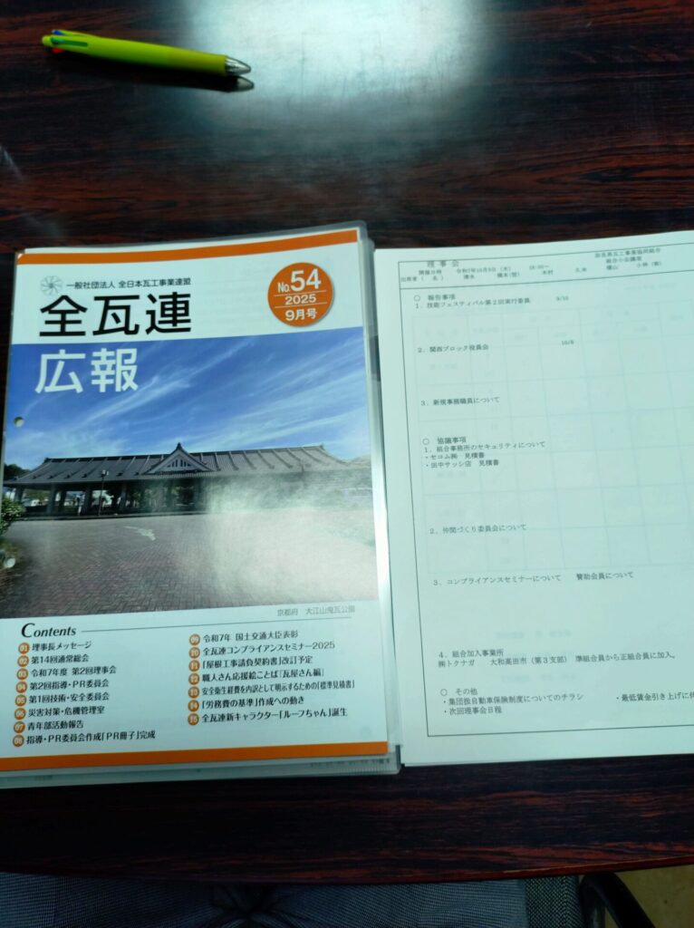 主な内容は、報告事項では「奈良技能フェスティバル第2回実行委員会」「全瓦連関西ブロック役員会」「新規事務局員について」、協議事項では「組合事務所のセキュリティーについて」「仲間づくり委員会について」「全瓦連コンプライアンスセミナーについて」「新規組合員加入事務所紹介」「来期の理事改選に伴う支部の理事数・監事数の見直し」などでした。
